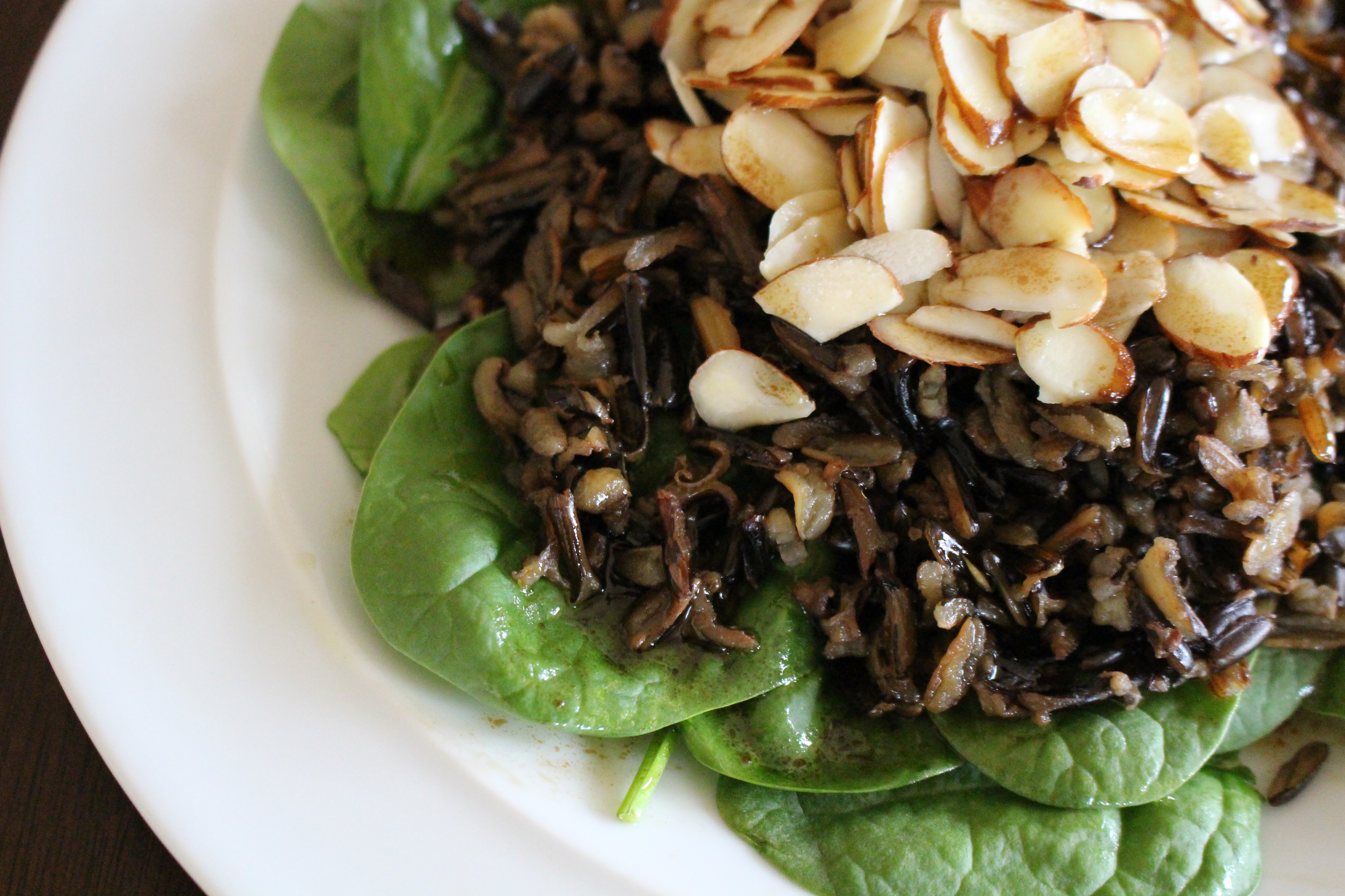 Put the first 5 ingredients in a rice cooker and cook until done (anywhere from 1 and 1/2 to 3 hours, depending on initial water temperature and type of cooker). This can also be done in a covered pot on the stove if need-be. While the rice is cooking, mix all of the dressing ingredients in a jar. Remove the rice from the cooker and toss or top with almonds and dressing.