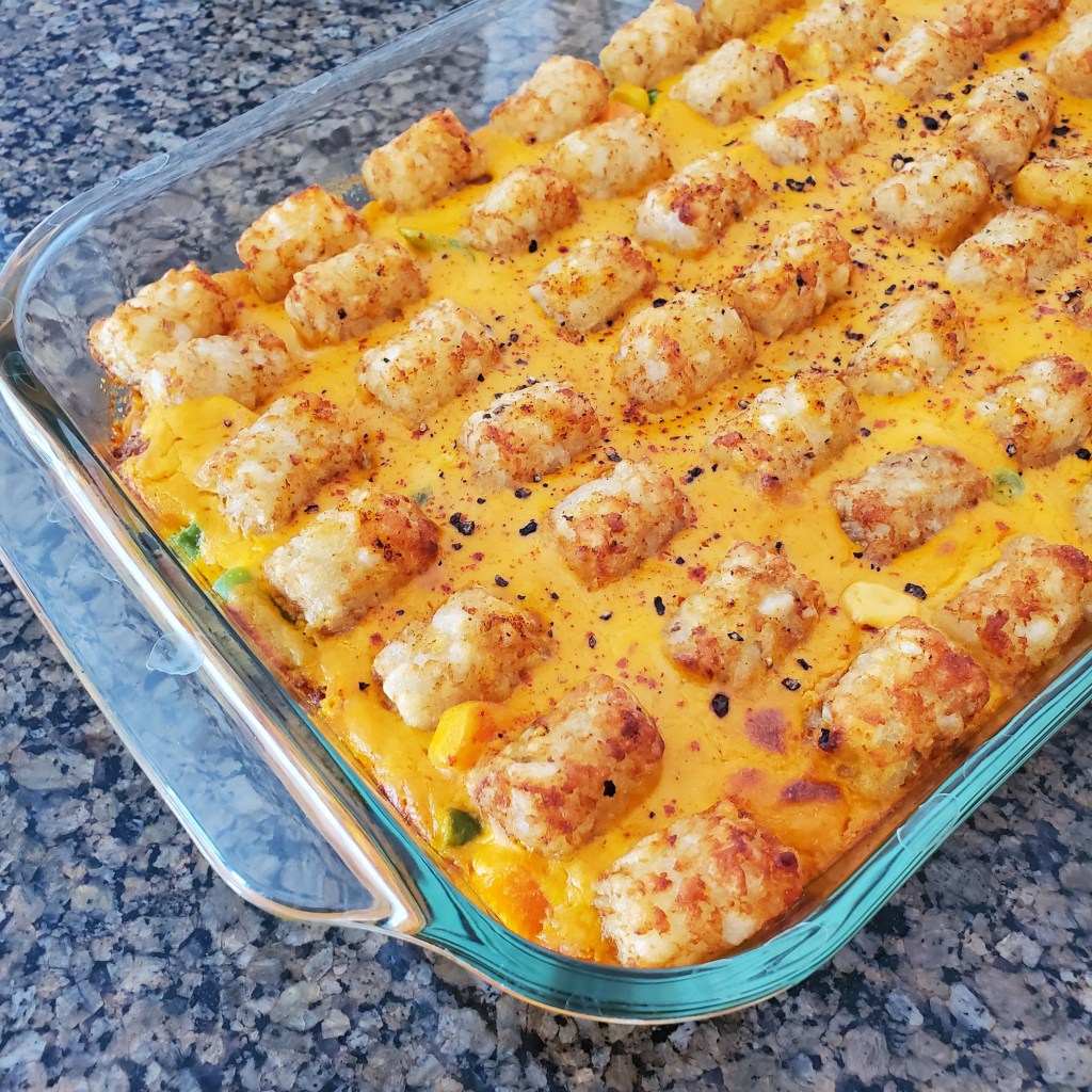 Heat the oven to 425 F. Cook uncovered for 25-30 minutes or until the tots are browned and there is at least some bubbling toward the center of the dish. Cool for 5 to 10 minutes and serve!